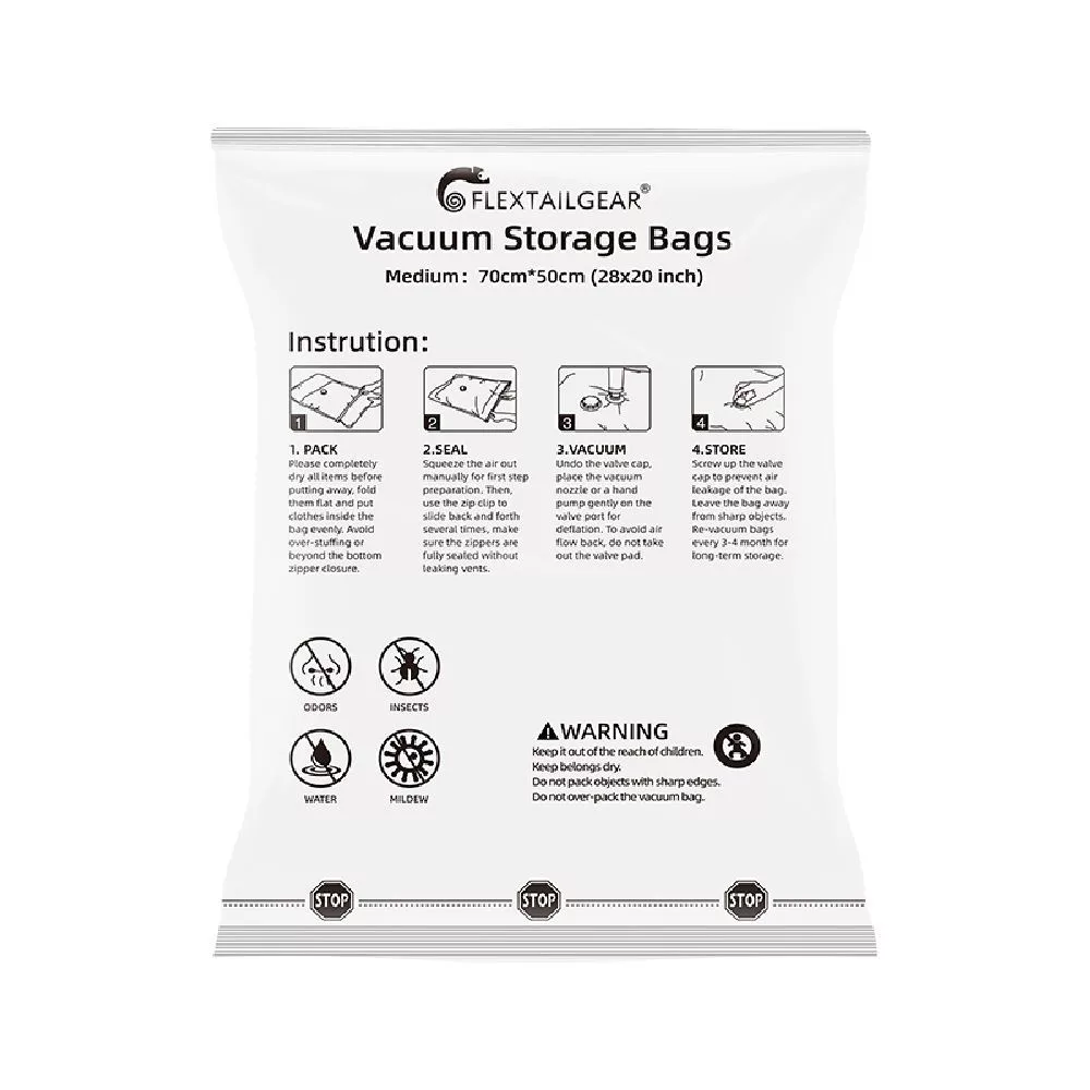 A Flextail vákuumzsák szett ideális választás mindazok számára, akik szeretnék optimalizálni a tárolóhelyüket. A zsákok erős, tartós anyagból készültek, és speciális dupla cipzárral, valamint háromszoros tömítő szeleppel rendelkeznek, amelyek megakadályozzák a levegő visszaáramlását. A vákuumozás egyszerűen elvégezhető kézi pumpával vagy porszívóval.