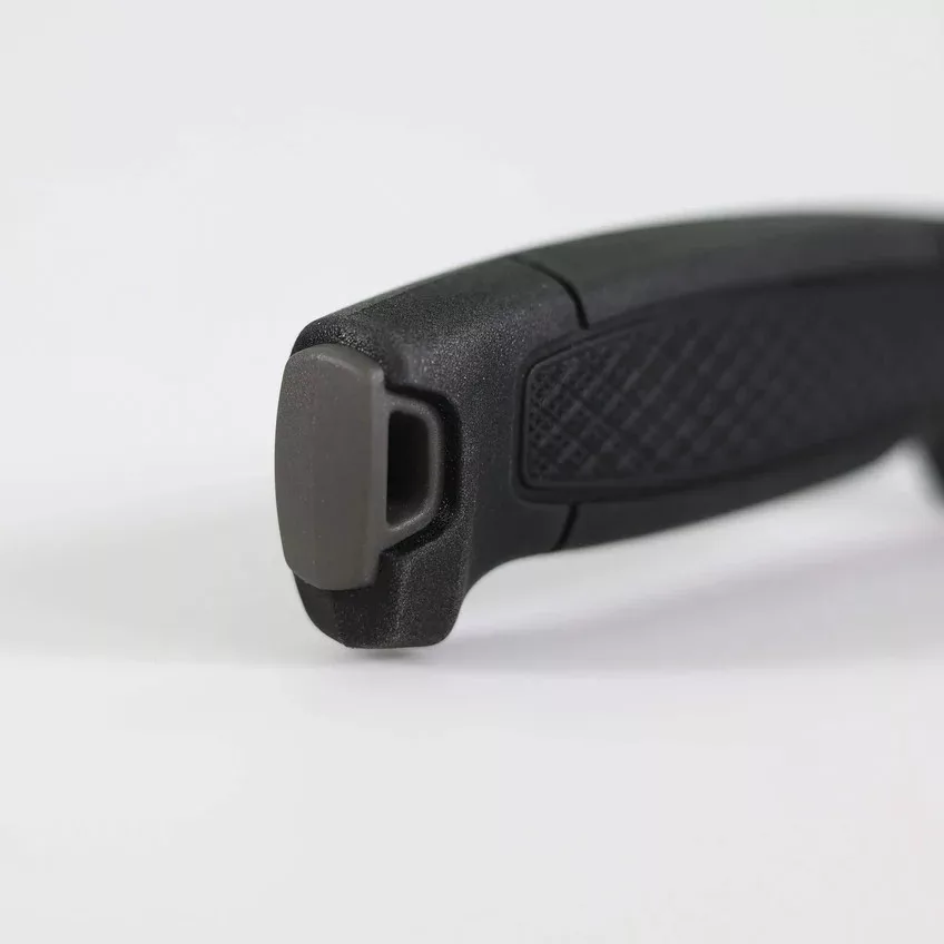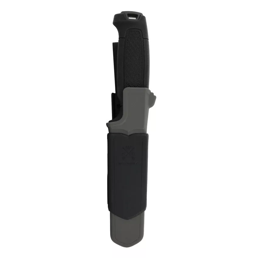 A kés spine-ja tűzgyújtóval (ferro rod) kompatibilis, így ideális túlélési és bushcraft helyzetekben is. A markolat egy modern, háromkomponensű kialakítás (PP mag + TPE külső réteg), amely biztos, csúszásmentes fogást ad nedves, hideg vagy sáros környezetben is.