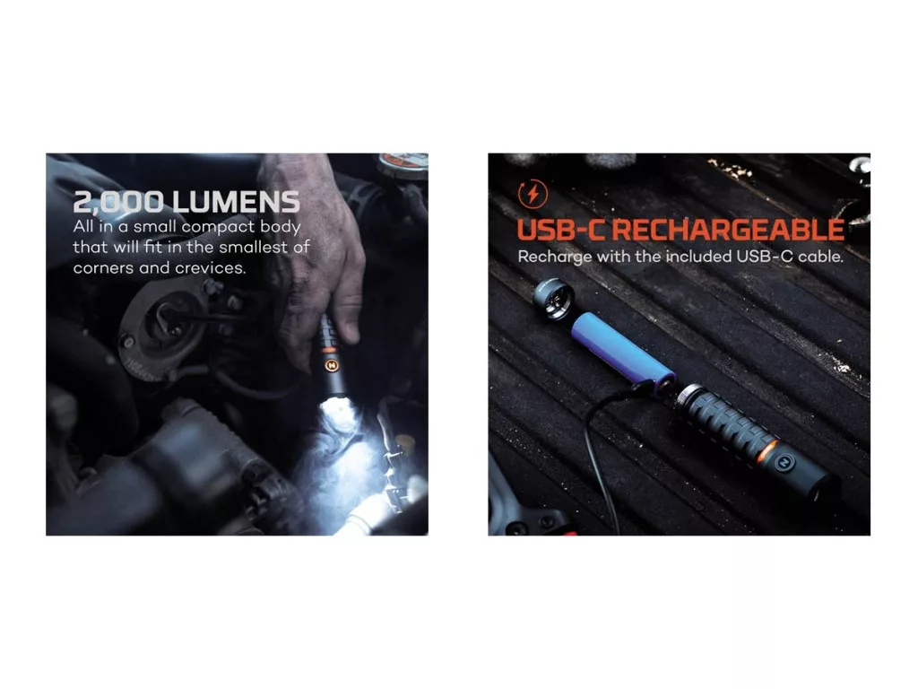 A TORCHY 2K USB-C-n keresztül tölthető, vízálló (IPX6), és 5 világítási móddal rendelkezik. Nagy teljesítményű zseblámpa levehető, kétirányú csipesszel rendelkezik a kényelmes hordozás érdekében.