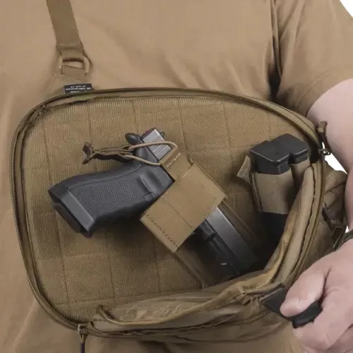 A Helikon-Tex EDC Sling hátizsák egy kompakt,részletgazdag hátizsák, amelyet úgy terveztek meg,hogy minél személyre szabhatóbb legyen. Ezért a fő rekesznek nincs belső zsebe, és kompatibilis a Versatile Insert System®-el. Emellett az első részen két zseb található - az egyik oldalsó cipzárral ellátott, a másik egy csattal rögzített, részben elasztikus.Főbb lényeges szempont továbbá a zsákban elrejtett hátsó rekesz,amely zipzárral zárható, mégis gyors hozzáférést biztosít a Quick Side Access segítségével. így a kézifegyvered tárolására, és elrejtésére tökéletesen kompatibilis, ugyanis a belsőterébe bélelt, puha velúrt helyeztek elsősorban pisztolytartó betét rögzítésére.Ezáltal kézifegyveredhez gyorsan hozzá tudsz férni.A táska továbbá profilozott vállpánttal van ellátva, amelybe egy pici cipzáras zseb is helyet kapott.