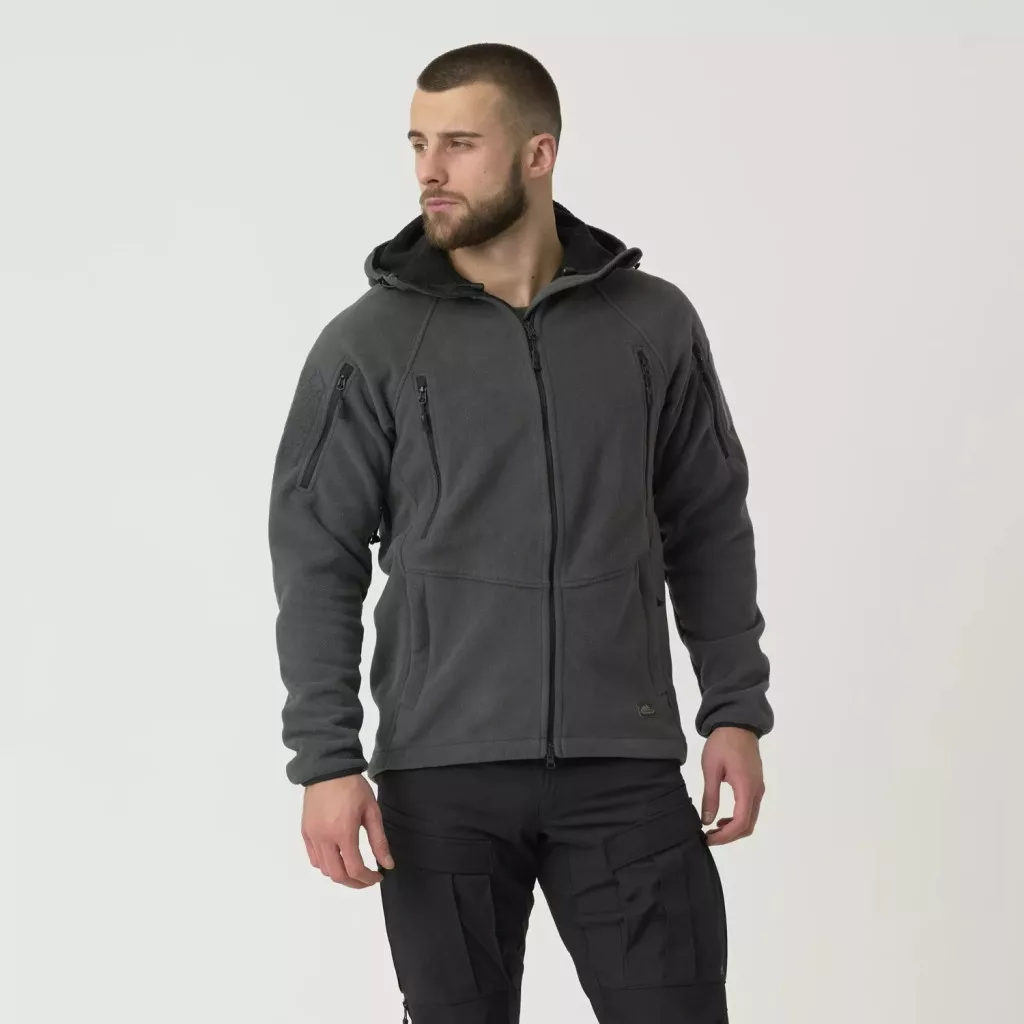 A Hybrid Fleece anyag két különböző rétegből áll. Kívülről klasszikus gyapjúra hasonlít, belül viszont egy rácsos gyapjú, amely az Alpha Hoodie-ból és az Alpha Tactical Jackets-ből ismert. Jellegzetes finom kockás szerkezetű anyag, vastagabb, magasított négyzet alakú darabok és vékonyabb rések közöttük. Ez a Patriot Mk2-t könnyebbé és légáteresztővé teszi, miközben melegen tart. A karok alatt cipzáras szellőzőnyílások segítik a hőszabályozást. Hét zsebben minden szükséges dolog elfér. Kettő mellmagasságban és két új zseb alul, a csípőn. A felhasználónak nagyobb szabadsága van a zsebekben lévő dolgok elrendezésében. A kezeit is a lehető legkényelmesebben tudja tartani. Ezen kívül két zseb a vállán és egy belső zseb. A felhasználók javaslatára lemondtunk a vese magasságában lévő hátsó zsebről és a bal alkaron lévő kis zsebről. A taktikai ruházatnak funkcionálisnak és kényelmesnek kell lennie, ezért a kabát és a kapucni modernebb kialakítására összpontosítottunk. A Patriot Jacket Mk2 jobban illeszkedik és nem korlátozza a mozgást.