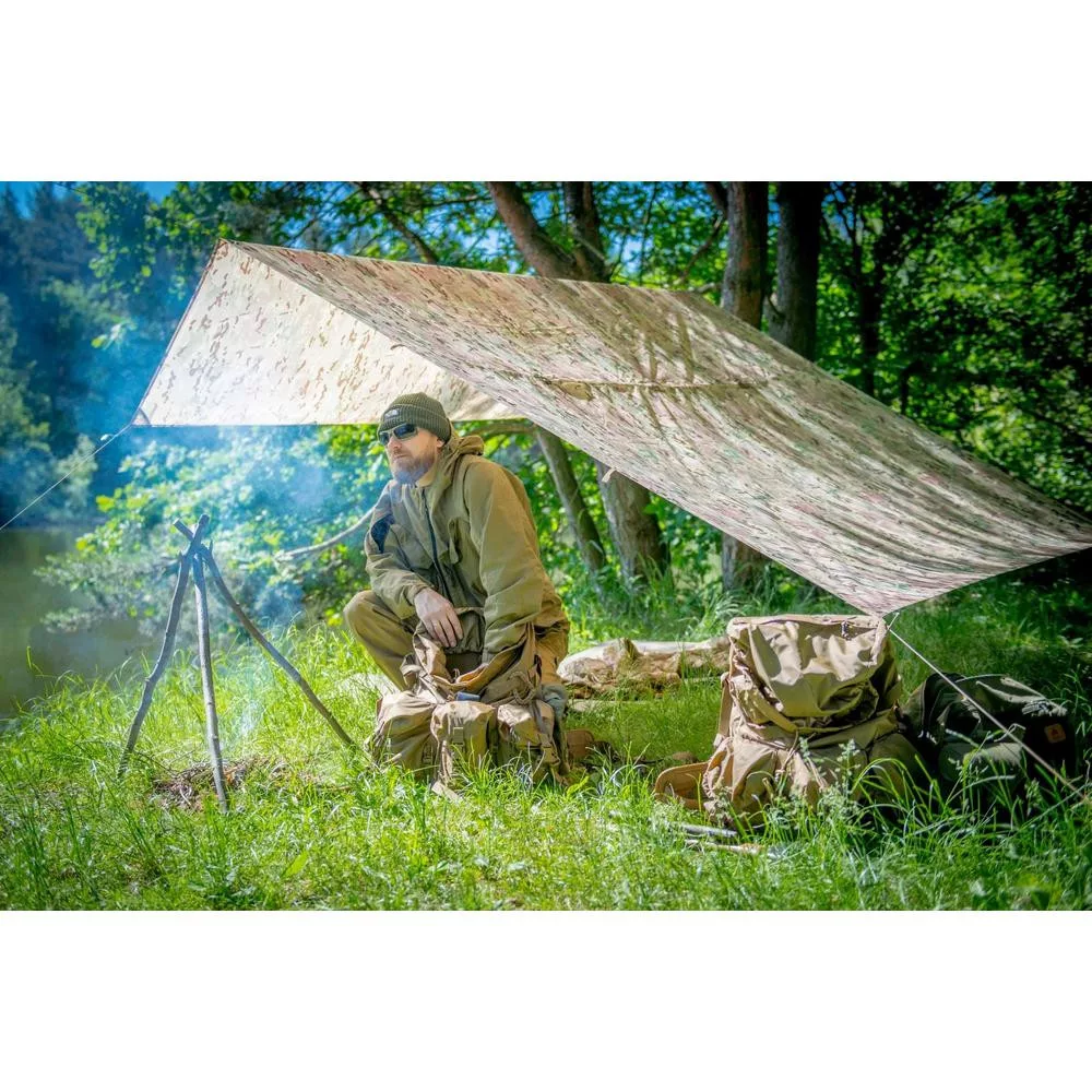 Helikon-Tex sátorponyva, mely 19 rögzítési ponttal rendelkezik, ennek köszönhetően számtalan módon használható bármilyen terepen. Könnyű és erős a ripstop anyagnak köszönhetően. A nyolc heveder segítségével pedig táskához lehet rögzíteni, nem veszi el a helyet a táskában.